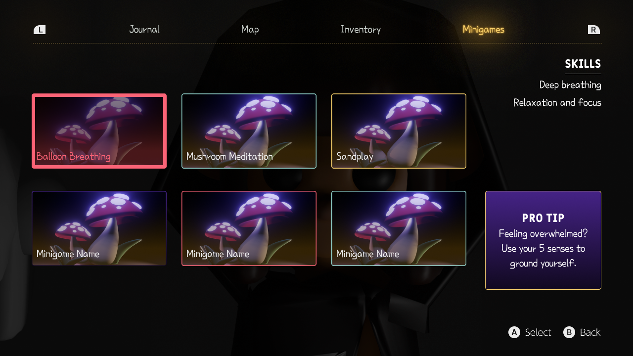 Create a game design for the Nintendo Switch that helps users passively learn therapeutic coping skills to transfer from a digital world to real-life scenarios