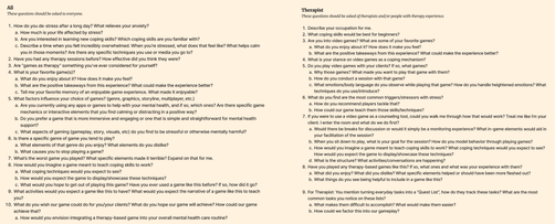 The therapists want opportunities to facilitate conversation with their clients, particularly citing the pause menu as a chance to discuss in-game progress and decisions.